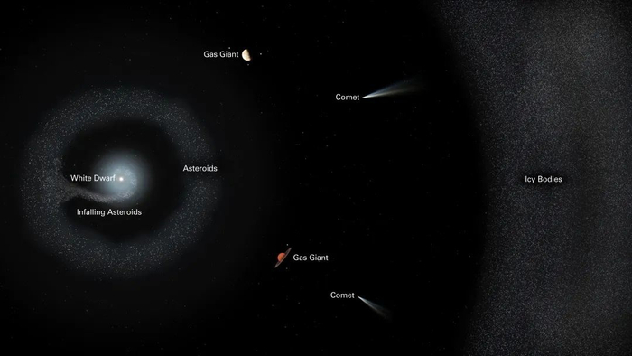 当它还是红巨星时,就已经吞噬掉了离它较近的行星。当成为白矮星后,原本的行星系统会在剧烈扰动下变得混乱,靠近它的行星将会被撕裂成无数的碎片,成为像小行星带一样的碎片环。这些小行星或碎片随着白矮星的吸积,不断向白矮星周围的气体尘埃盘跌落,最终落入白矮星表面。而对于距离较远的行星和彗星带来说,很长一段时间内它们或许是安全的。但是杀戮过程一旦开启,终将有一天它们也不可避免地会成为白矮星的盘中餐。