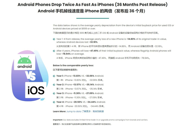 实际数据表明,第一年iPhone折旧13.83%,而安卓手机折旧32.06%;第二年iPhone折旧13.57%,而安卓手机折旧35.14%;第三年iPhone折旧11.30%,而安卓手机折旧27.09%。