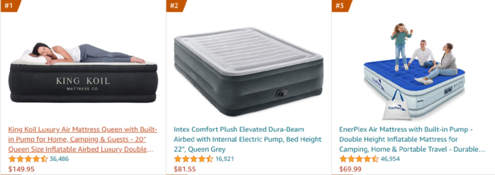 作为亚马逊运动和户外类目的明星品类,户外充气床垫的价格区间集中在20美金~150美金不等,其中Best Seller排行第一的产品隶属King Koil品牌,累计评论数近40000。