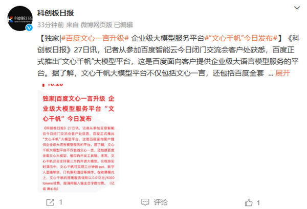 此前,百度曾宣布将在今天召开发布会,推出“文心一言”相关的云服务和应用产品,但该发布会在早些时候宣布改为面向首批邀约测试企业的闭门沟通会。