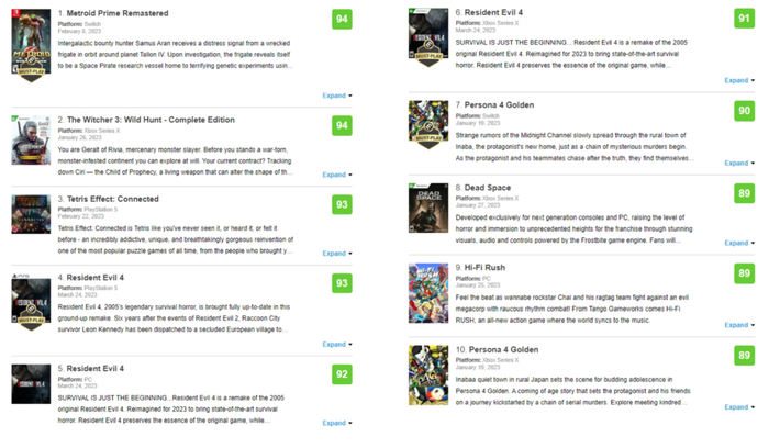 从2023年开始至今,已经有不少出色的游戏和玩家见面,在著名的评分网站Metacritic上,目前今年评分前十的作品,有八款是重制游戏,算得上是一种独特的光景,这其中《生化危机4:重制版》更是豪夺三个席位。
