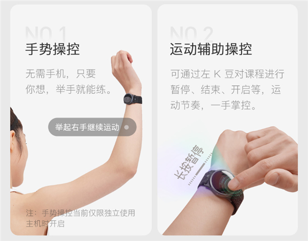 两个 K 豆各有分工,在都能负责动作识别的基础上,一个能完成心率监控、快捷课程操作,另一个还能完成 RFID( 频射识别,后面有个功能会讲到 )。