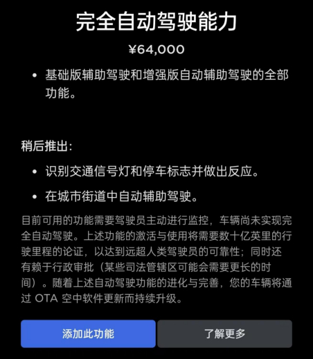 一位特斯拉门店销售向新浪科技表示,在购买特斯拉车辆时,一些基础版的功能会标配,比如自适应巡航、车道保持;增强版自动辅助驾驶需要32000元加购;完全自动驾驶能力则需要64000元加购,将包含基础版辅助驾驶和增强版自动辅助驾驶的全部功能,并且未来会通过OTA更新使车辆拥有完全自动驾驶能力。