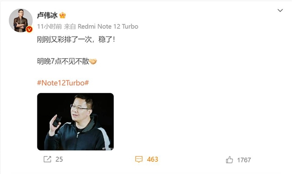 Redmi Note 12 Turbo今天发!卢伟冰彩排完发布会后说“稳了”