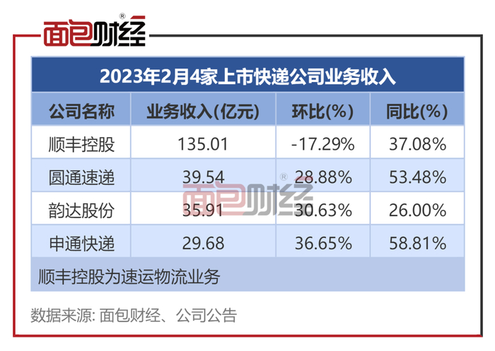 顺丰控股2月实现业务收入135.01亿元,仍在4家上市快递公司中居首。圆通速递、韵达股份2月份业务收入也均超过30亿元。
