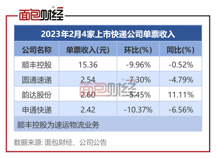2023年2月,披露月度经营数据的4家上市快递公司单票收入同比、环比均普遍出现下滑。