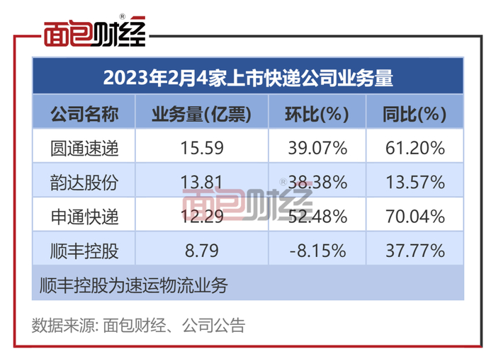 快递公司2月经营数据:顺丰业务量、业务收入环比双降