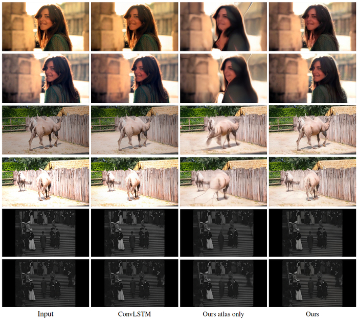 如上图所示,研究者的算法可以很好的去除输入视频中的闪烁。注意,第三列图片展示了神经图层的结果,可以观察到明显的缺陷,但是研究者的算法可以很好的利用其一致性又避免引入这些缺陷。