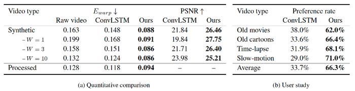 研究者提供了 (a) 处理的到的闪烁视频和合成的闪烁视频的定量比较,研究者的方法的变形误差比基线要小得多,根据 PSNR,研究者的结果在合成数据上也更接近于真实值。对于其他真实世界视频,研究提供了 (b) 双盲实验以进行比较,大多数用户更喜欢研究者的结果。