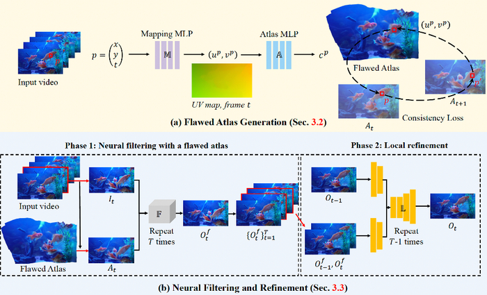 一种良好的盲去闪烁模型应该具有跟踪所有视频帧之间对应点的能力。视频处理中的多数网络结构只能采用少量帧作为输入,导致感知野较小,无法保证长期一致性。研究者观察到神经图集非常适合闪烁消除任务,因此将引入神经图集到这项任务中。神经图集是视频中所有像素的统一且简洁的表示方式。如图 (a) 所示,设 p 为一个像素,每个像素 p 被输入到映射网络 M 中,该网络预测 2D 坐标(up,vp),表示像素在图集中对应的位置。理想情况下,不同帧之间的对应点应该共享图集中的一个像素,即使输入像素的颜色不同也应该如此。也就是说,这可以确保时间一致性。