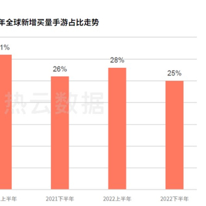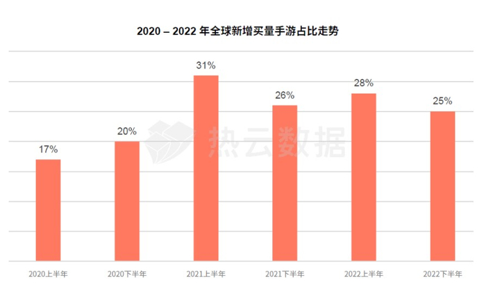 2022 年下半年全球新增的买量手游占比为 25%,仍处于近 3 年的相对高位| 图源:Sensor Tower《2022 全球手游买量白皮书》