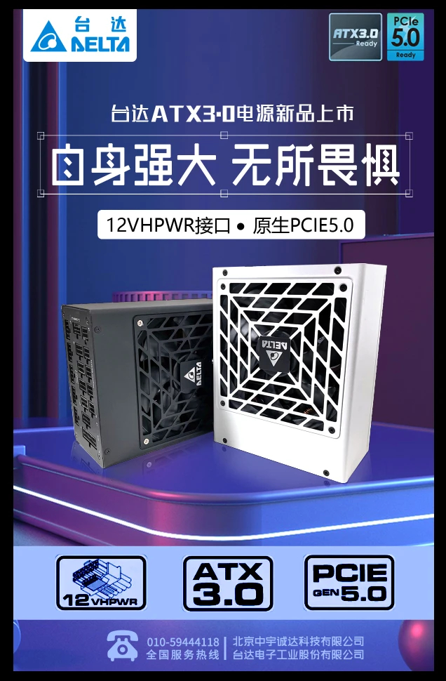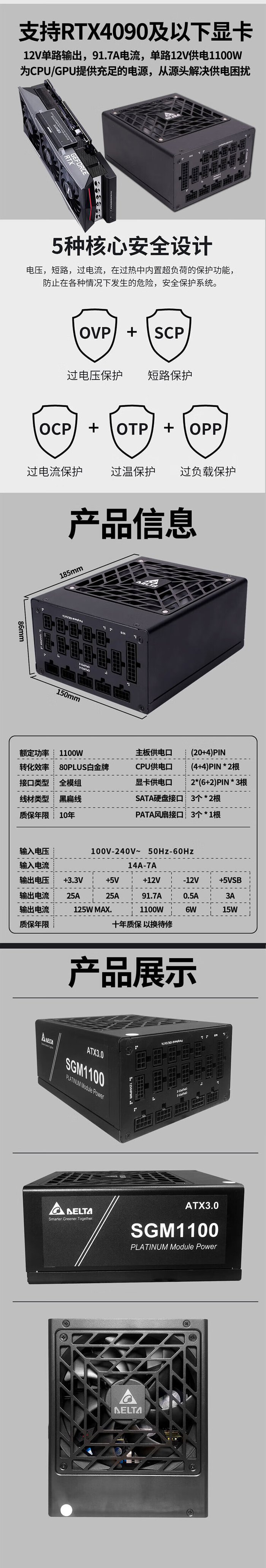 台达 SGM1100/1300 电源采用 ATX 3.0 标准打造,支持 12V HPWR 16 针接口,符合 PCIe 5.0 规范,可直连新一代 RTX 40 系列显卡,拥有白金牌效能认证。