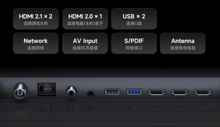 硬件方面,小米电视 S 系列新品搭载四核 A73 处理器,配有 3GB + 32GB 存储,拥有两个 HDMI 2.1 接口、一个 HDMI 2.0 接口、两个 USB 接口,以及网口、AV 输入口等。