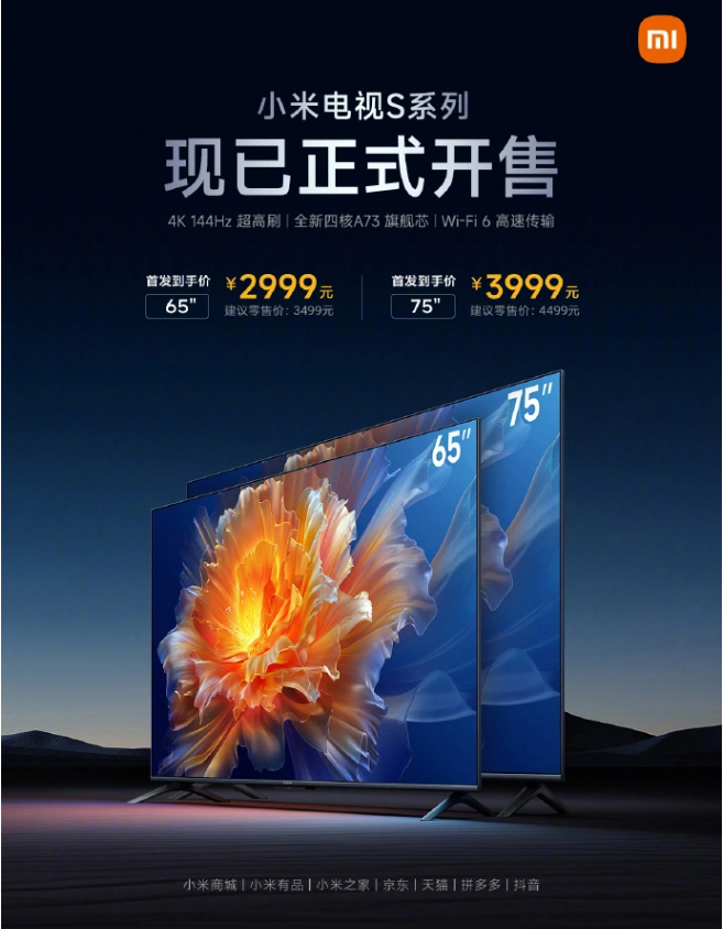 3 月 28 日消息,小米电视 S 系列新品今天十点正式开售,提供 S65 和 S75 两个版本,支持 4K 144Hz 超高刷,到手价 2999 元起。