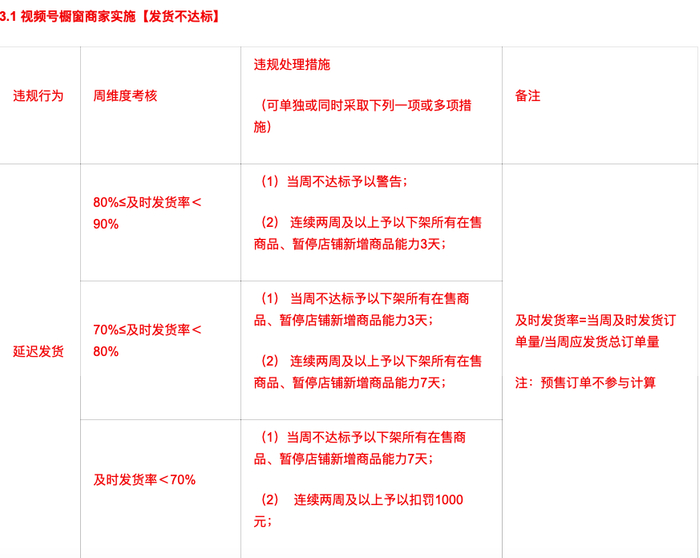 80%是视频号商家及时发货率的红线。当周低于80%,高于70%,下架所有商品,暂停店铺上新3天;而连续两周及以上,下架所有商品,暂停店铺上新7天。