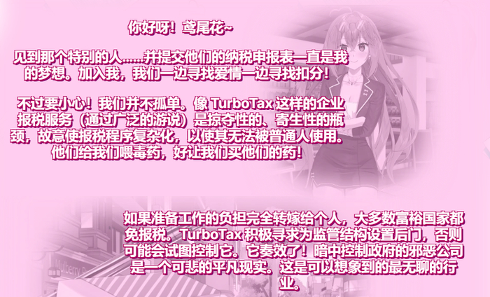 从功能角度来看,这款游戏所能提供的报税服务很有限,更多的像是一种行为艺术,在大企业垄断美国报税服务的现状来看,可以把它理解成一次小小的抗议,只是方式更加奇特,还包裹了一层“美少女恋爱”的浪漫。