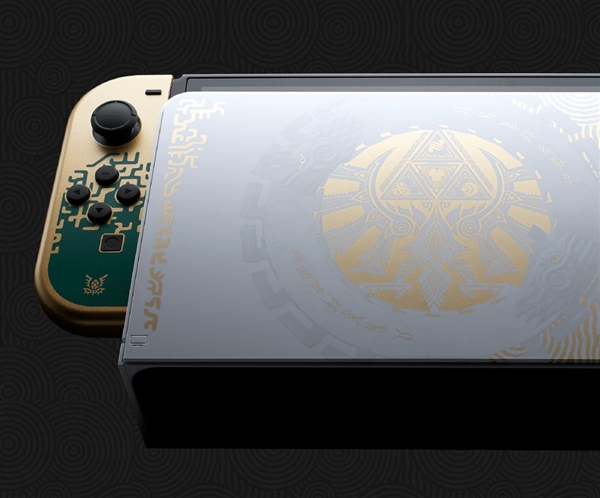 从官图来看,《塞尔达传说:王国之泪》限定Switch基于白色OLED版设计,手柄主色为金黄色,带有绿色符文和白色圆环条纹,底座正面则是金色三神图案,主机背面为圆环条纹,整体来看十分吸睛,尤其是酷炫的金黄手柄。