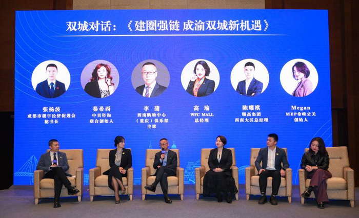 在重大战略机遇和国家政策的双重加持下,2023年,川渝两地如何推动成渝地区双城经济圈建设乘势而进?由成都市楼宇经济促进会秘书长张杨波主持,中贝咨询联合创始人秦希西、西南购物中心(重庆)俱乐部主席李蒲、WFC MALL总经理高瑜、浙江颐高集团西南大区总经理陈耀棋、MEP希唯公关创始人Megan等来自成渝两地的企业代表围绕如何持续壮大成渝地区双城经济圈经济实力,以“建圈强链 成渝双城新机遇”为主题,在民生服务、国际消费中心城市建设、楼宇经济双城联动、成渝创意文化、产业建圈强链等方面建言献策。