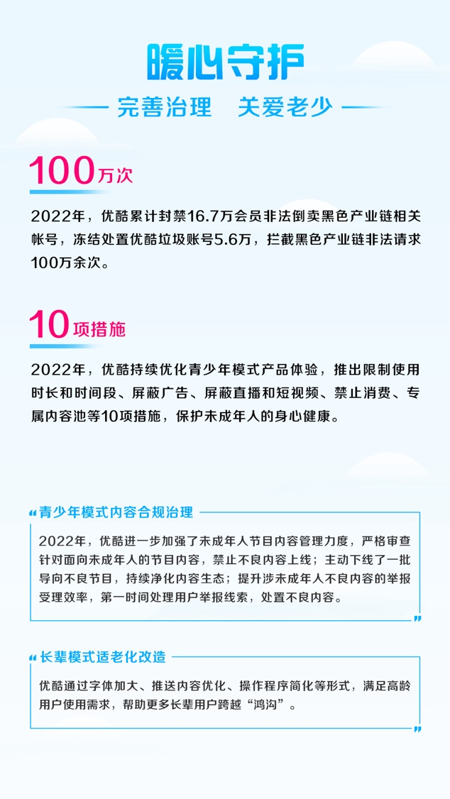 同时,优酷也加强对青少年模式的合规治理,推出了屏蔽广告、禁止消费、专属内容池、时长时段限制等10项措施,保护未成年人的网络安全。
