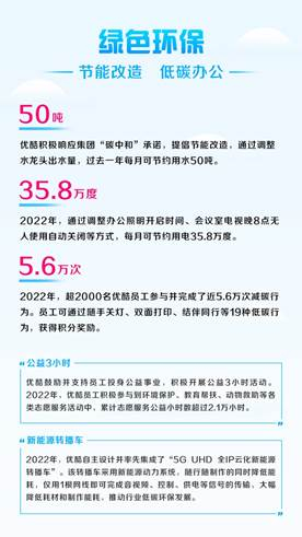 优酷还积极响应“碳中和”承诺,践行节能减排。2022年,通过各项节能降耗措施,每月可节约用电约35.8万度、节约用水约50万吨。并对员工随手关灯、关空调、双面打印等19种低碳行为,实行积分奖励,超2000名优酷员工去年共参与完成了近5.6万次减碳行为。