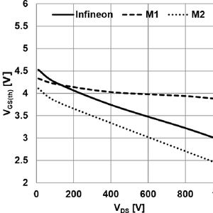 Fig.1:不同制造商1200V SiC MOSFET的VGS(th)曲线,Infineon-沟槽,M1-沟槽,M2-平面