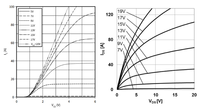 典型的IGBT输出特性曲线(左)与SiC MOSFET输出特性曲线(右)