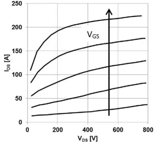 由于上述的DIBL效应,与IGBT相比,SiC MOSFET的输出特性看起来有所不同。在相同VGS条件下,器件的饱和电流随VDS上升而上升。见图2。