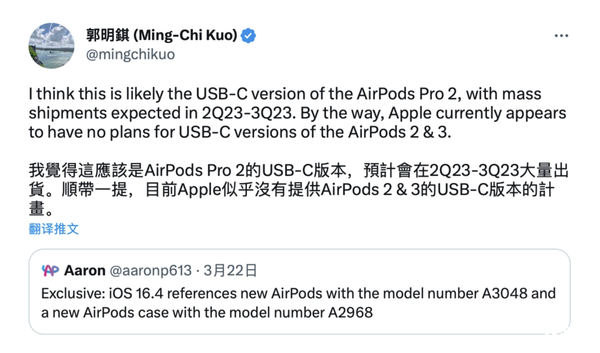 因此采用USB-C接口AirPods Pro 2的推出也就顺理成章。不过郭明錤还提到,苹果目前并没有推出同样使用USB-C接口的AirPods 2和AIrPods 3的打算。