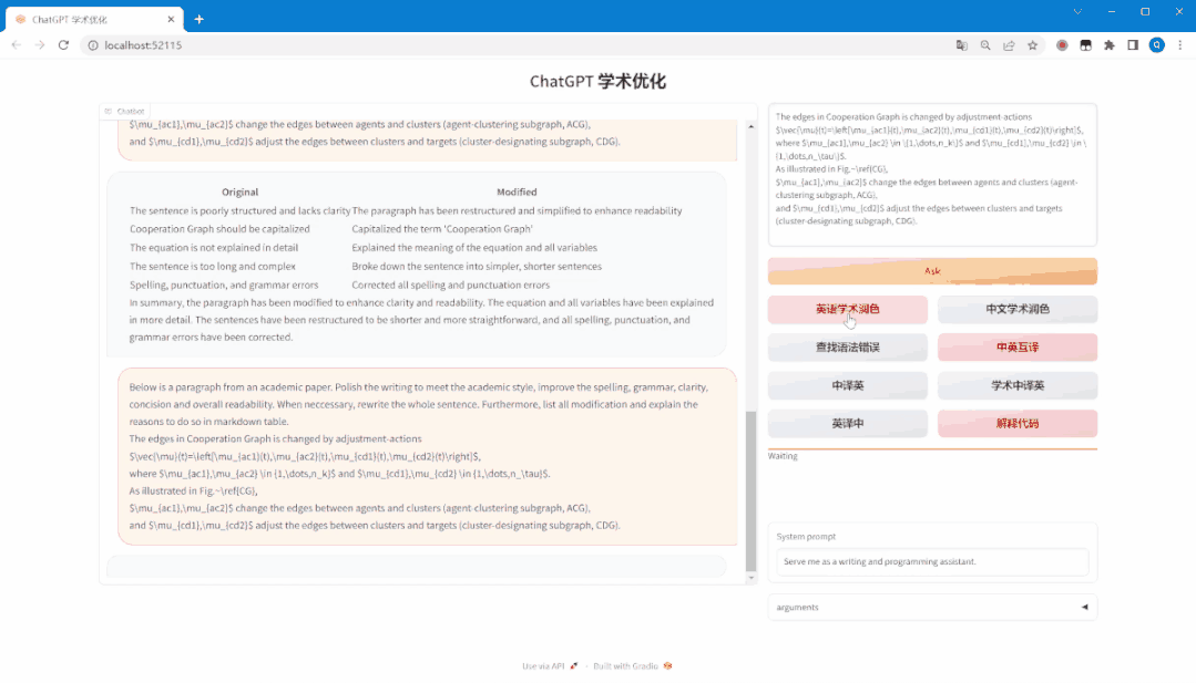 我们来看一下 chatgpt_academic 的具体功能与使用效果。例如,一键润色学术论文: