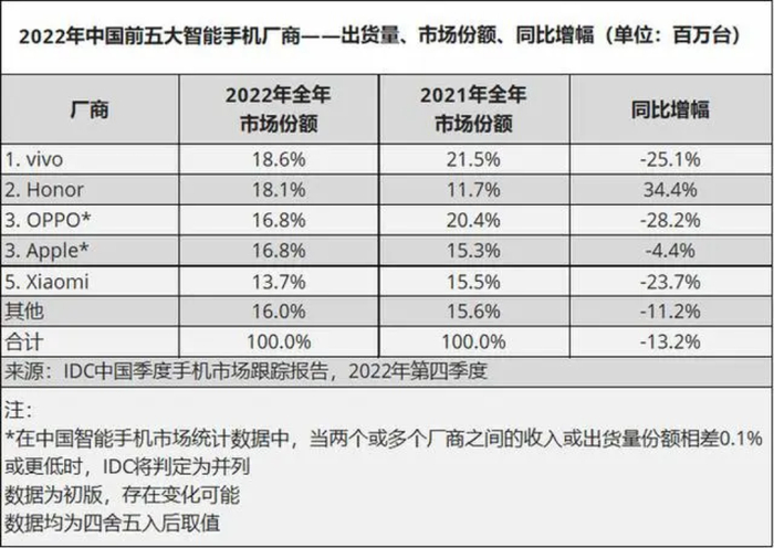 第三方市场机构IDC公布的2022年手机跟踪报告显示,去年,vivo以18.6%夺得中国智能手机市场份额第一的位置。而OPPO则以16.8%的市场份额位列第三,同比下滑28.2%,在国内Top 5的智能手机厂商中,成为失去市场份额最多的厂商。