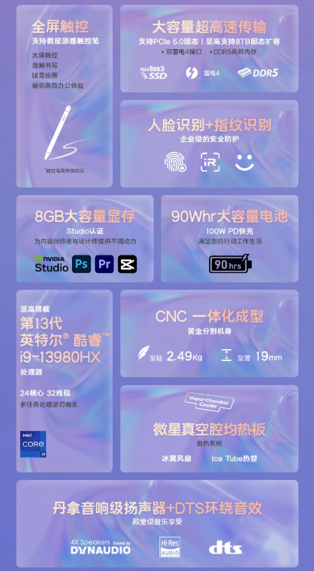 该机搭载英特尔 13代酷睿 i9-13980HX 处理器以及英伟达最新的 RTX 40 系列显卡,通过 NVIDIA Studio 认证。它配备了 DDR5 内存,支持最大 8TB 的 PCIe Gen 5 固态硬盘,拥有微星真空腔均热板 + 冰翼风扇以及 lce Tube 热管,配备 1.5mm 键程的赛睿键盘,拥有数字小键盘和全高方向键,自带个性化 RGB 灯效,采用独特机械结构以及 SinkZone 下沉式设计,还有 AG 磨砂玻璃的大面积触控板。