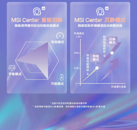 其他方面,该机拥有 IR FHD 摄像头、丹拿音响级扬声器 + DTS 环绕音效,可通过 MSI Center 根据实际环境噪音自动调整效能,亦或者根据使用情况自动切换效能模式,支持电池管理大师功能,例如 100W(PD)的 AI 充电模式,以及 280W 的 DC 快充。