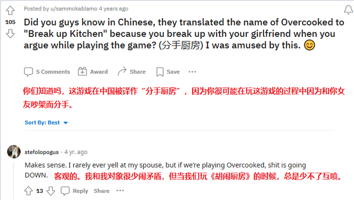 尽管“分手厨房”只是《Overcooked》系列在国内的民间叫法,但相比《胡闹厨房》或《煮糊了》两个官方译名,这个俗称不仅更知名,甚至还远传海外并得到认可——毕竟不管是哪国的情侣,都可能因为一起玩这个游戏而闹掰。
