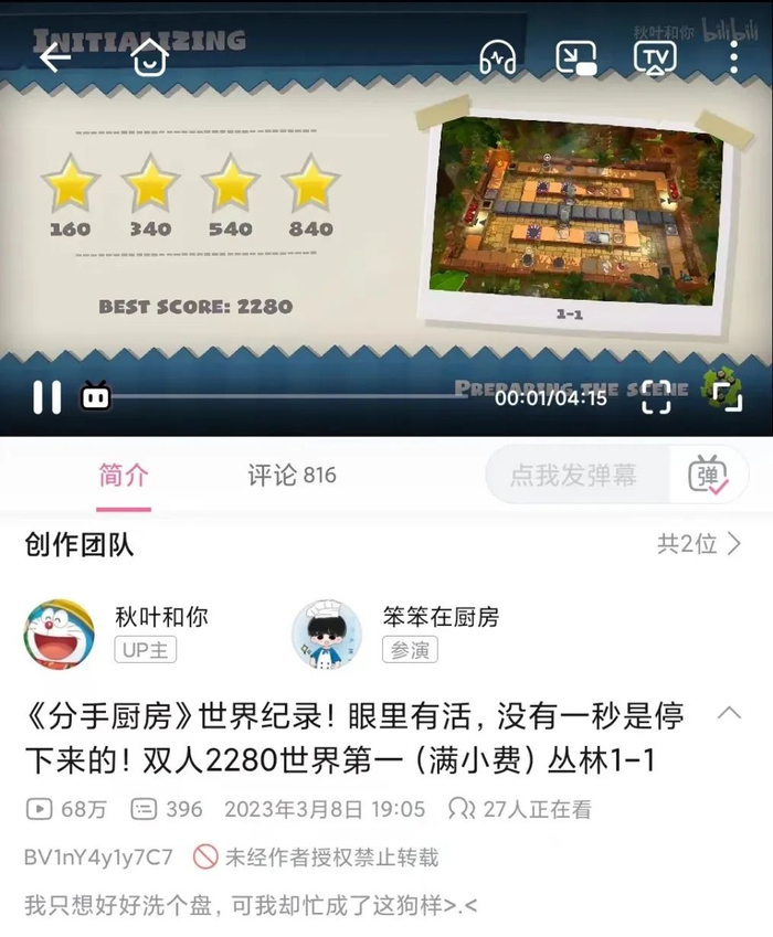 秋叶和笨笨也是熟络的搭档,一同拿下了许多纪录,在3月初,他俩又刷新了自己保持的丛林1-1纪录,这个视频也久违地让《分手厨房》登上了B站热门。