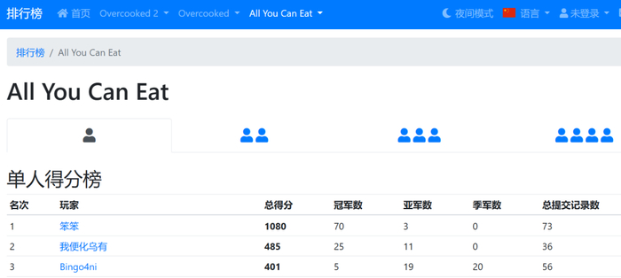 更重要的是,这位叫蛋蛋的玩家提及了一个域名为overcooked.greeny.dev的网站,一群高手玩家在这里纪录自己打出的关卡得分,网站则依此进行排名。换而言之,这里是玩家自发搭建的《分手厨房2》世界纪录网站,是全球真正“顶尖厨师”们的切磋之地。