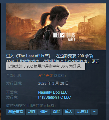 《最后生还者 第一部》登陆PC后,出现了严重的优化翻车。至于有多严重,目前Steam上仅36%的好评率,已经说明了玩家有多么愤怒。