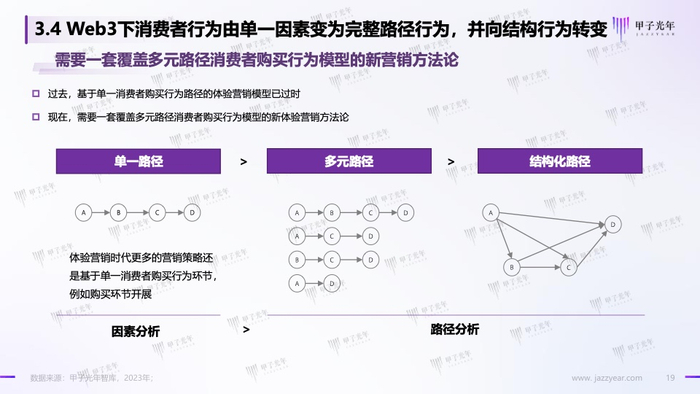 Web3下消费者行为由单一因素变为完整路径行为,并向结构行为转变,需要一套覆盖多元路径消费者购买行为模型的新营销方法论。