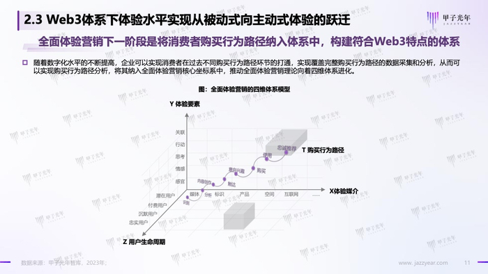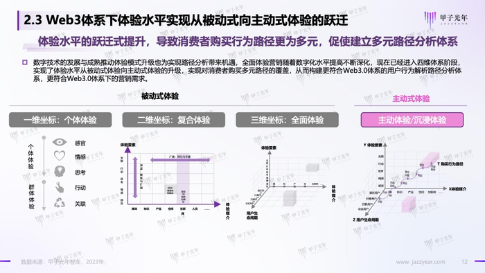 Web3体系下体验水平实现从被动式向主动式体验的跃迁,体验水平的跃迁式提升,导致消费者购买行为路径更为多元,促使建立多元路径分析体系,构建符合Web3特点的体系。