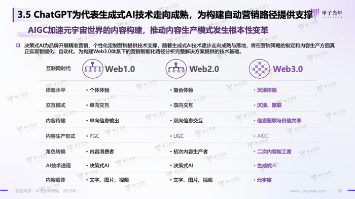 决策式AI为品牌开展精准营销、个性化定制营销提供技术支撑,随着以ChatGPT为代表的生成式AI技术逐步走向成熟与落地,将在营销策略的制定和内容生产方面真正实现智能化、自动化,为构建Web3.0体系下的营销智能化路径分析完整解决方案提供的技术基础。