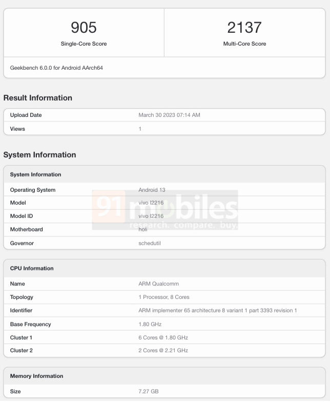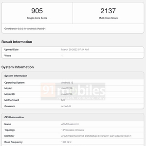 从 Geekbench 认证页面来看,iQOO Z7x 全球版单核测试得分为 905 分,多核测试为 2137 分。此外,这款设备的处理器预计为骁龙 695 移动平台,并有 8GB+128GB 内存版本可选,运行基于 Android 13 的 FunTouchOS 13 操作系统。