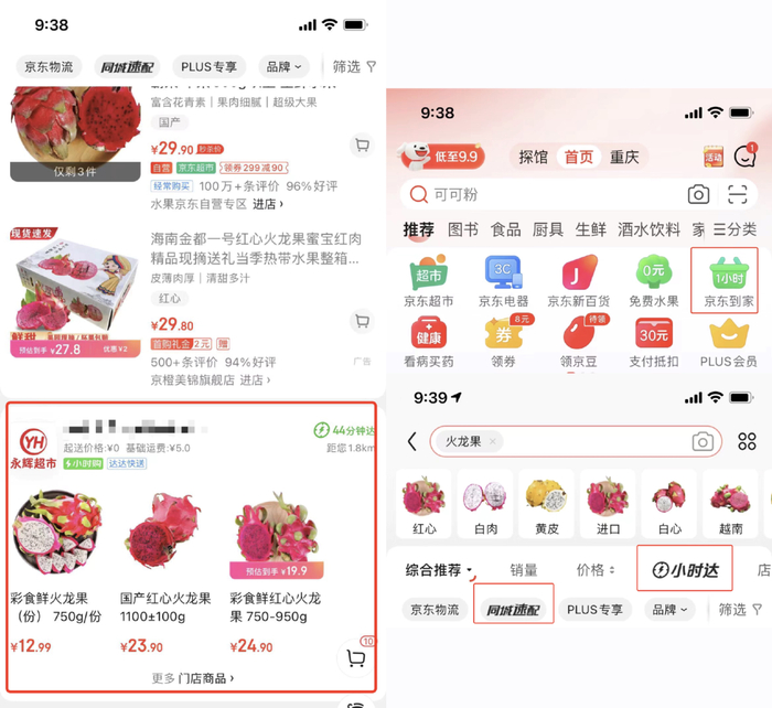 经常用京东的朋友如果仔细留意不难发现,京东app近两年发生了变化,这个变化就是在京东app中增加了很多京东到家的入口。当所长搜索某商品比如火龙果,搜索页面中就会出现当地超市相关商品的信息,如果点进去,就会直接跳转至相应超市的京东到家页面,搜索页面顶上也会有小时购、同城配送(就是京东到家)这类入口,app首页也有京东到家的直达入口……