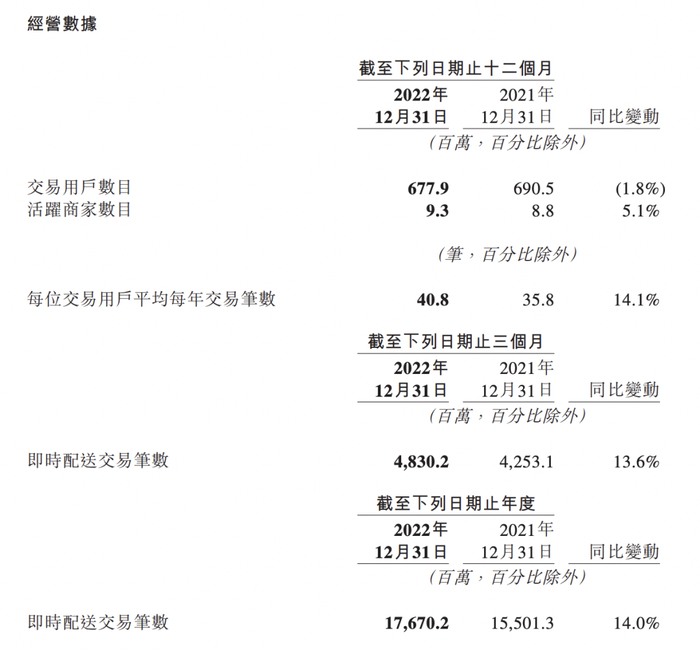 毕竟,万物到家说白了就是餐饮外卖的一种延伸,美团在餐饮外卖行业目前占据了近80%的市场。2022年,美团外卖日订单最高超过6000万(这里的外卖单子都指餐饮),即时配送(美团外卖+万物到家的美团闪购)订单量达176.7亿笔,相对去年同期增长14%,而且收入增速远远超过了订单量的增速,换句话说就是,客单价的提升远远大于量的提升。