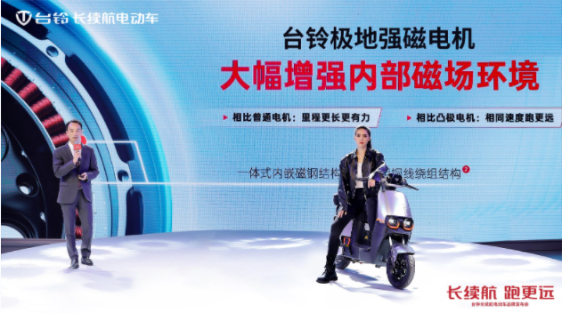 众所周知,台铃掌握了长续航电动车核心科技,实现了产品跑得更远,为继续推动长续航革命,会上执行总裁震撼发布了两项长续航新的技术成果——台铃极地强磁电机与台铃长续航钠离子电池。