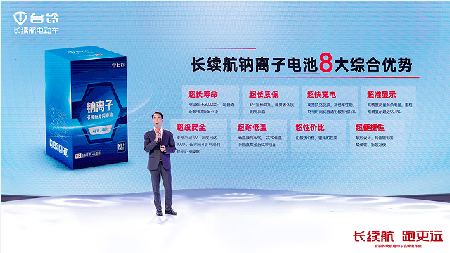 台铃集团执行总裁孙木楚表示,台铃长续航钠离子电池实现了8项优势点的跨越式升级,全方位解决了传统锂电池和铅酸电池的缺点,其电池寿命更长,支持快充快放,SOC电量预测精准度高,从而成功实现续航里程更长,跑得更远!