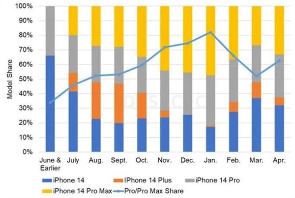 iPhone14系列中,iPhone14 Pro销量占比最高,iPhone14和iPhone14 Plus则是最不受欢迎的两款。