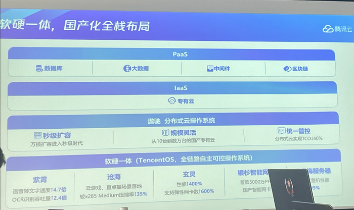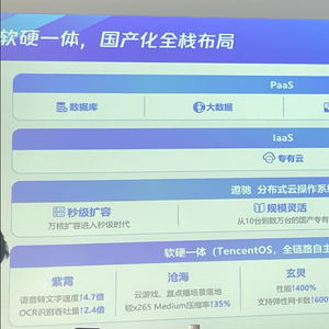 目前腾讯的国产化产品矩阵自下而上分别是:最底层的国产化硬件平台,包括AI芯片、网络DPU、智能网卡、自研服务器等;遨驰分布式云的操作系统,同时管理公有云、边缘,以及用户数据中心等;最上面的PaaS层,包括数据库、大数据、中间件、区块链。腾讯云副总裁刘颖表示,客户在选择国产化转型过程中,会优先考虑数据库选型,重点考虑兼容性、融合能力,以及一站式数据库SaaS能力。