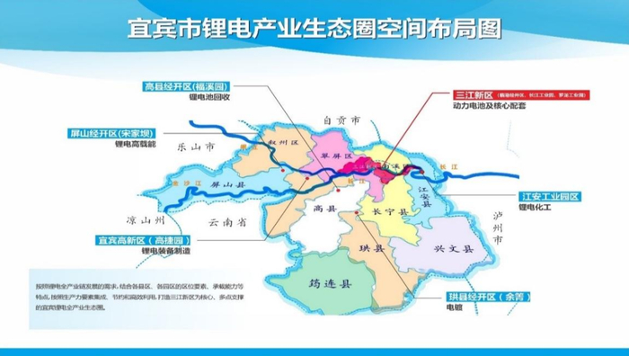 为营造良好的产业生态环境,宜宾着力构建“1+ N”动力电池绿色闭环全产业链生态圈,即以三江新区为圆心,三江新区(临港经开区)布局动力电池电芯及核心配套项目,翠屏区长江工业园区布局部分动力电池电芯、隔膜、结构件等核心配套项目,南溪区罗龙工业园区布局动力电池铜(铝)箔项目,江安经开区布局涉化工类动力电池前端材料(正极前驱体、电解液等)项目,珙县工业园区布局涉表面处理(电镀)工艺类项目,屏山县工业园区布局动力电池负极材料项目,高县工业园区布局动力电池回收循环利用项目,长宁经开区星光坝园区布局储能电池产业项目,叙州区高新技术园区布局其他辅材等。