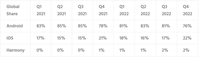 Counterpoint:2022年Q4华为鸿蒙OS全球市场份额2%,中国市场份额为8%