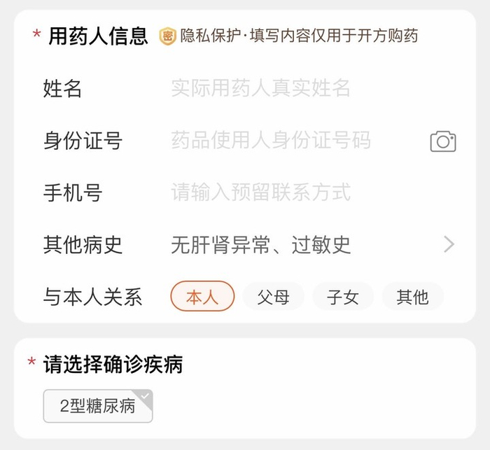 因为它是处方药,网购前需要填写用药人的姓名、身份证号、手机号、疾病类型(必须是 2 型糖尿病)以及处方单。