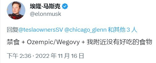 但到了同年 11 月,他在 Twitter 上回应,借助 Wegovy 和 Ozempic,再结合禁食,已经减下了 30 磅(约 13.6 千克)。